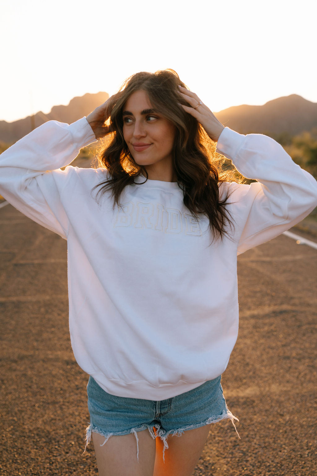This bride sweatshirt with elegant embroidered text is the ideal choice for the bride-to-be as she prepares for her big day! This charming future Mrs. crewneck sweatshirt makes a delightful engagement gift she will treasure.
