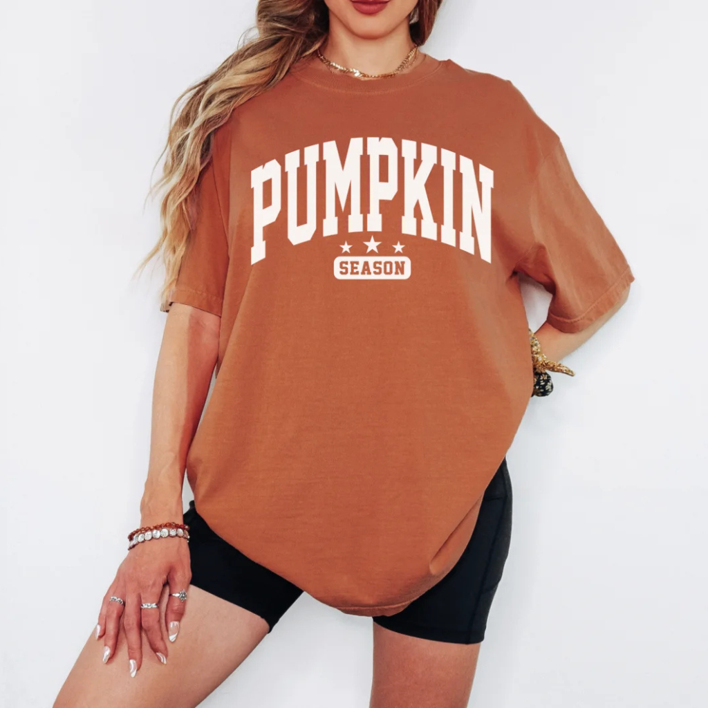 It’s officially Pumpkin Season. Celebrate it with this cute and cozy tee featuring Pumpkin Season athletic style, and slay that golden-hour fall feeling. A must-have for your seasonal wardrobe, whether you're heading to a pumpkin patch or just need something comfy for sipping cider on the porch.