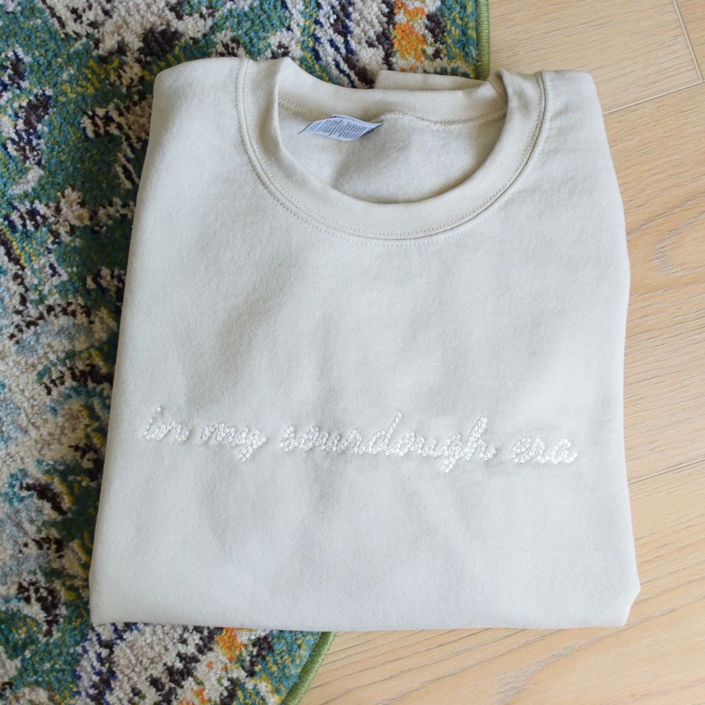 Wrap yourself in warmth and style with our "In My Sourdough Era" Crewneck Sweatshirt. Featuring a chic embroidered design, this cozy sweatshirt perfectly blends comfort and personality, making it an ideal choice for sourdough enthusiasts everywhere.