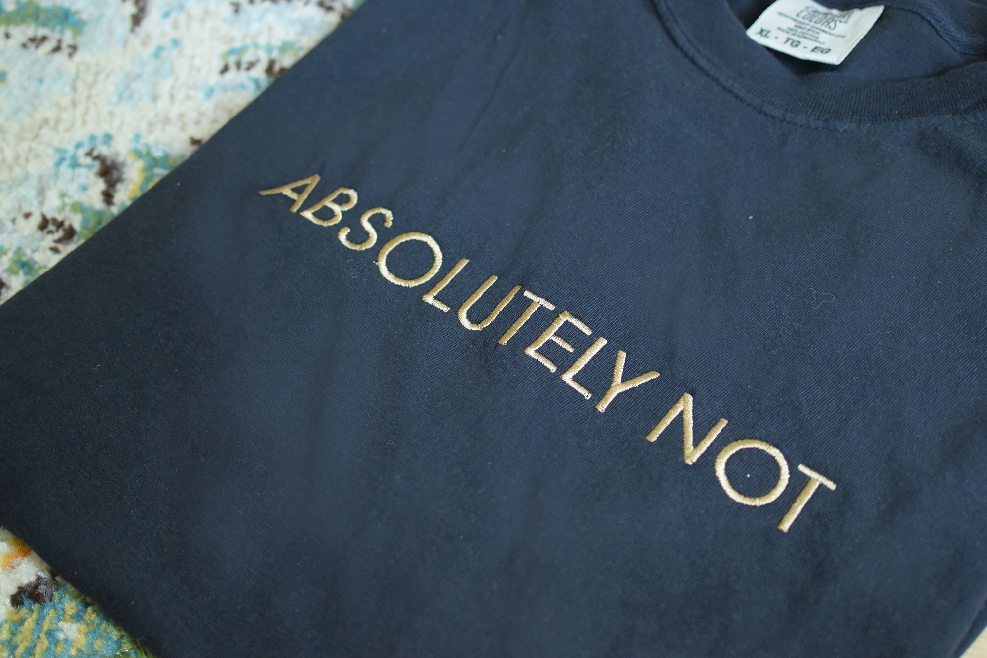 Make a statement with our "Absolutely Not" embroidered tee. This stylish shirt is perfect for those who confidently set boundaries, showcasing your bold attitude in a chic and fashionable way.