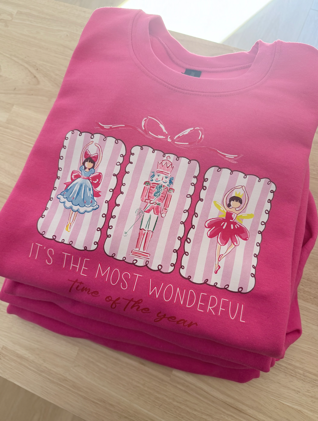 Celebrate the magic of the holidays with our It’s The Most Wonderful Time of The Year Pink Sweatshirt, inspired by the elegance and charm of the Nutcracker Ballet. This festive design features a delightful trio of holiday characters — each framed in candy-striped pink with a touch of whimsical flair.
