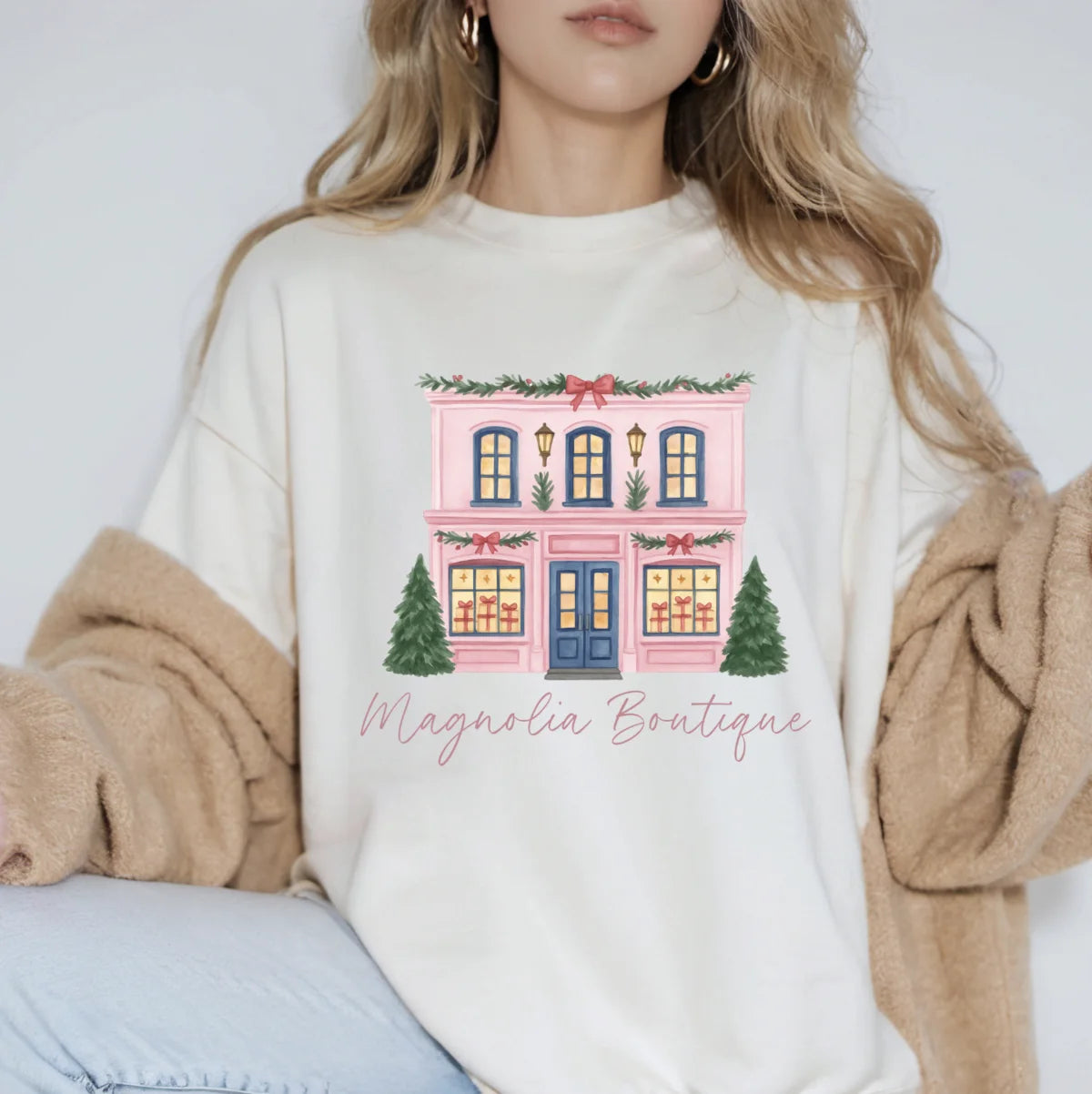 Featuring a hand-illustrated pink storefront design adorned with Christmas trees, garlands, and bows, this shirt can be personalized with your boutique or business name for a one-of-a-kind holiday look. Whether you’re sipping cocoa at your shop, attending a holiday market, or cozying up at home, this piece makes a statement that’s merry and meaningful.