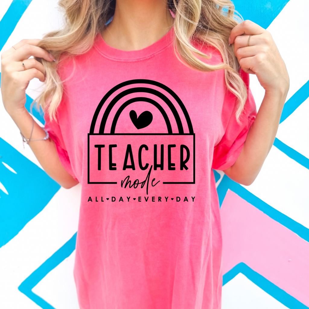 Get ready to educate in style with our Teacher Mode Comfort Colors Tee. Featuring a playful "Teacher Mode" graphic, this tee is the perfect way for educators to showcase their passion for teaching while staying comfortable throughout the school day.