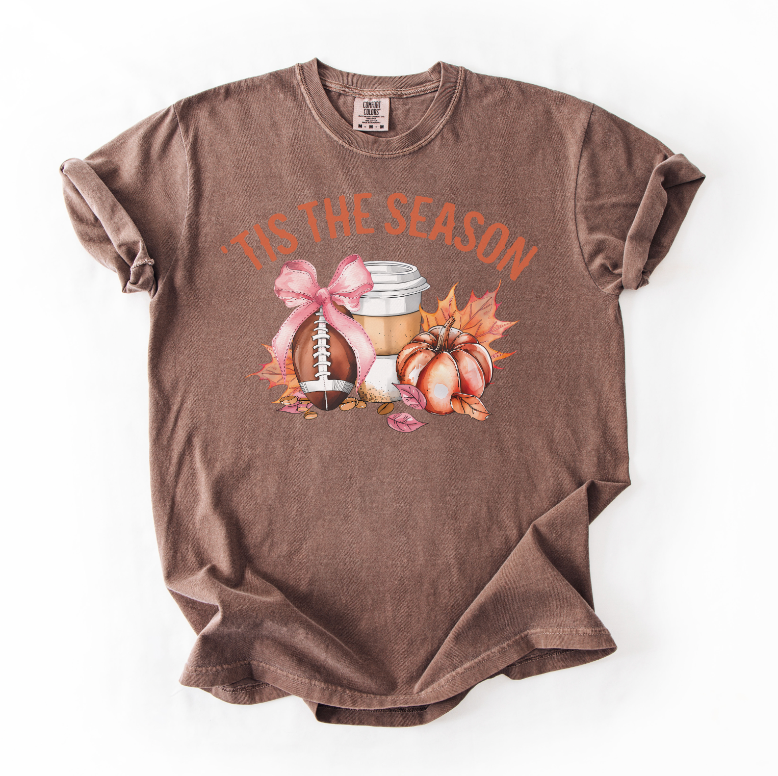 Say hello to the coziest trio of the season—pumpkins, lattes, and falling leaves. Our Tis The Season Three Fall Essentials Comfort Colors Tee wraps all your favorite autumn vibes into one adorable and comfy graphic tee.